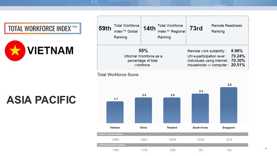 “Theo kết quả nghiên cứu năm 2021 giữa ManpowerGroup Việt Nam và Viện Khoa học Lao động & Xã hội (thuộc Bộ LĐTBXH), kỹ năng ngoại ngữ được các doanh nghiệp sản xuất FDI tại Việt Nam đánh giá 3,6 trên thang điểm 4 về mức độ quan trọng mà người lao động cần có. Tuy nhiên, theo TWI 2021, hiện chỉ có 5% lao động Việt Nam có kỹ năng tiếng Anh công sở. Ngoài ra, tỉ lệ lao động có kỹ năng cao nước ta chỉ chiếm 11,6%, khá thấp khi so sánh với các thị trường lao động cùng nhóm (trung bình 20%).”